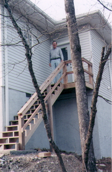 The picture on the left shows a small deck and staircase which come out the back of the house. This deck's origins are kind of funny. When the floor plan was finished, Kay said she wanted a door from outside into the laundry room so that Nelson would have a place to come in and shed filthy clothes without tracking through the house. It would also be the only door in the back of the house for emergency exits.
