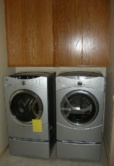If you know from the start that you are going to have a front loading washer and dryer, you should be aware that normal overhead cabinets will be hard to reach because front-loaders are deep. And they are usually mounted on bases which makes getting to cabinets set back above them even harder. (Not having the bases will involve a lot of bending over, which is not a pleasant option for those of us