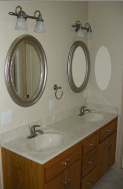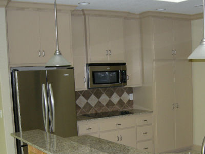 The two upper cabinets to the right of the appliance garage were my 3rd design flaw. (You probably don't want to hire me to design a kitchen for you.) These cabinets have two sets of doors which open facing each other. I had planned that this would be two cabinets, each with shelves going all the way across behind two doors. This is how our kitchen cabinets are. What I overlooked is that our cabinets are only about 27" wide, but Judy's are 36" wide. Shelves that long would sag, eventually, unless bulky supports were added. So the cabinet builder put a dividing wall between each set of doors and the shelves only had to run 18" for each section.
