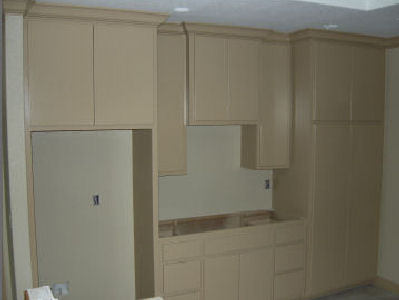In the pictures above, you can see that the cabinets just to the right of the oven cabinet are about half the size as in my drawings and model. One reason is that the oven cabinet was pushed over several inches to make room for the light switches. That could have been avoided by putting the switches on the other side of the wall, just outside the door, but I didn't think of it when we were placing switch boxes.