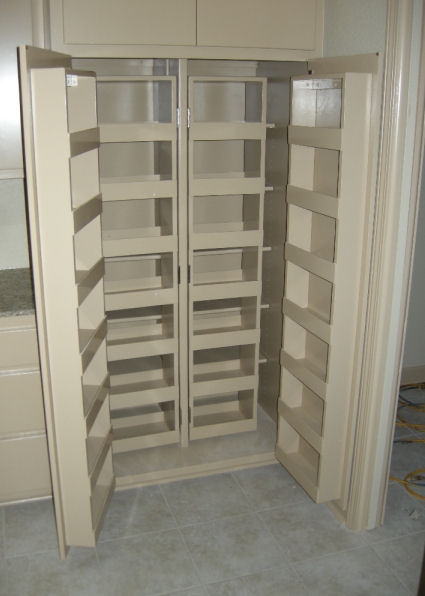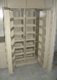 The cabinet builder said that we didn't have enough space to build a walk-in pantry with an angled door the way I had it planned. This was my second big design flaw. This time the cabinet builder saved me by suggesting the kind of pantry seen below. The front set of shelves swings out for access to the back set, and more shelves line the inside of each door: