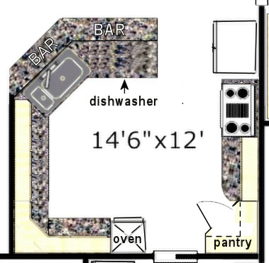 Above is the original plan for Judy's kitchen. The problem with it is that you cannot see how the cabinets will actually look, how many there will be, what width they need to be, etc. So I used a graphics program to draw the cabinets.