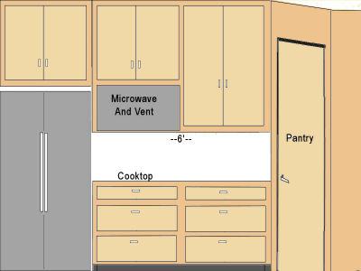 The above right shows the right wall of the kitchen on the floor plan. At first I put the cooktop and microwave/vent to the left next to the refrigerator so that the cabinets to the right of it would be the same width as the cooktop area, 3'.
