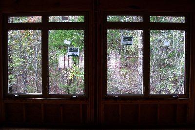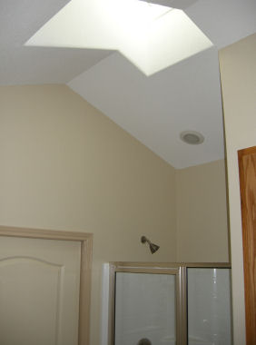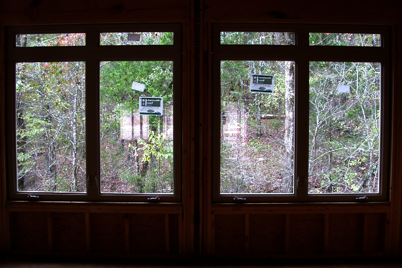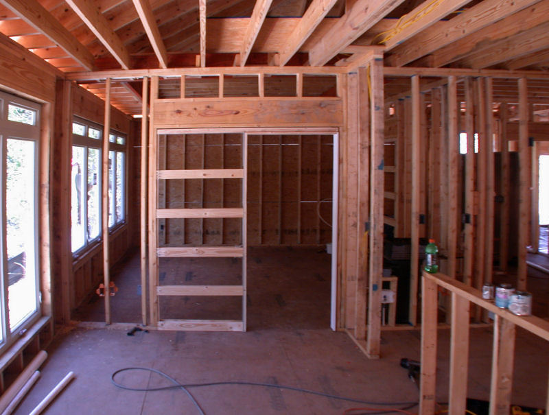 The windows above face due West, right into the afternoon sun. Ordinarily, this would be a bad thing for most of the year because of the heat and light coming in, but about 15' behind the house are a lot of tall tress which will block most of the sun during the warm months, but which will let heat into the house during the cold months when the trees lose their leaves. Without the trees, it would be better to find a lot where these windows would face North. If the windows faced South, you could have wider than normal eaves to block the Summer sun and let in the Winter sun. If you have a patio or deck out back, you could cover it to block the Western sun, but that will make the house darker all the time. In our house, we added tint to windows on the West side, which helps some. In Judy's house, we specified windows with Low-e and very low (.30-.32) heat gain (SHGC) and heat loss (U-factor) ratings. A low VT rating means that not as much light gets through because the windows have a tint built in (as opposed to applied in a sheet); we didn't specify low VT, but Buss apparently did because we can tell by looking that they have some tint to them, which will reduce glare. A low U-factor (heat-loss rating) is particularly important with a lot of windows because you will lose a lot of heat through them during the cold months. Window coverings help, but kind of defeat the purpose of having the big windows in the first place. While on the subject of the wall of windows -- something I didn't know to specify, but which Buss did, was to make the window-wall studs 2x6 rather than 2x4 like the rest of the house. The reason is that the windows do not provide any structural support. In addition to the 2x6s, a large header board runs the length of the 28-foot wall of windows, plus in the picture above, you can see that on either side of the door are FIVE 2x6 studs. The electrician actually had to carve out a space to put the light switches by the door. Folks, this is a SOLID house!