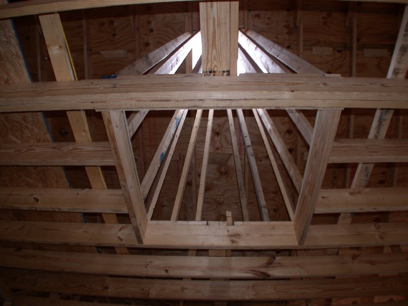 the 2x4 studs and 2x6 ceiling joists. Not only are they large, but they are doubled up. Now compare them to the joists used to frame a similar step-up ceiling (above the worker's head)