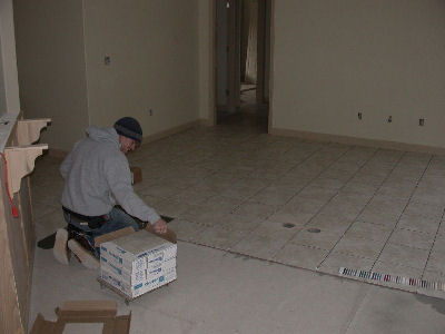 Living room tile being installed: