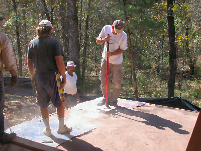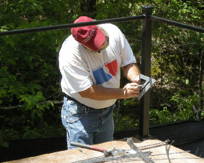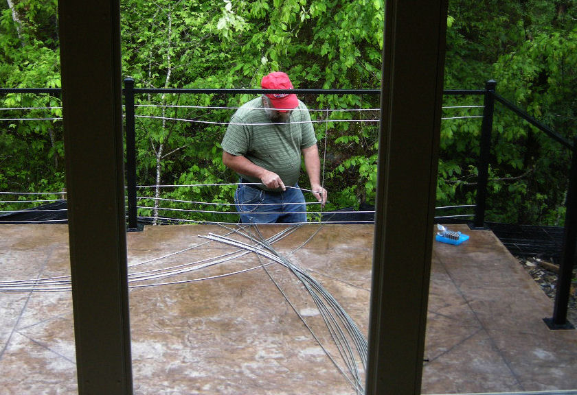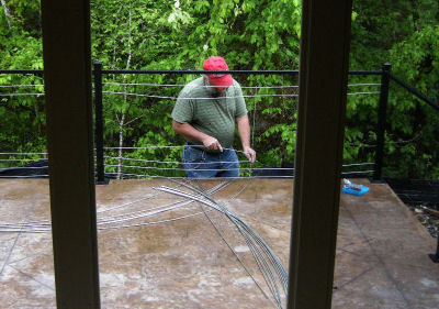 Over 250 holes had to be drilled in the steel posts for the stainless steel cables -- a job made even more tedious by the need for the holes to be prefectly aligned and spaced to allow the cables to go through each post for the 28' length of the patio. The black steel rails at the top were welded in place to help the posts withstand the tension of the cables.