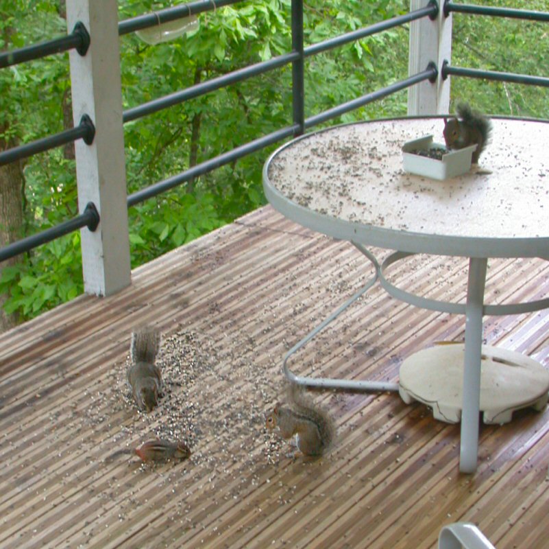Hard to see, but it's flying squirrels in the bird feeder at night.
