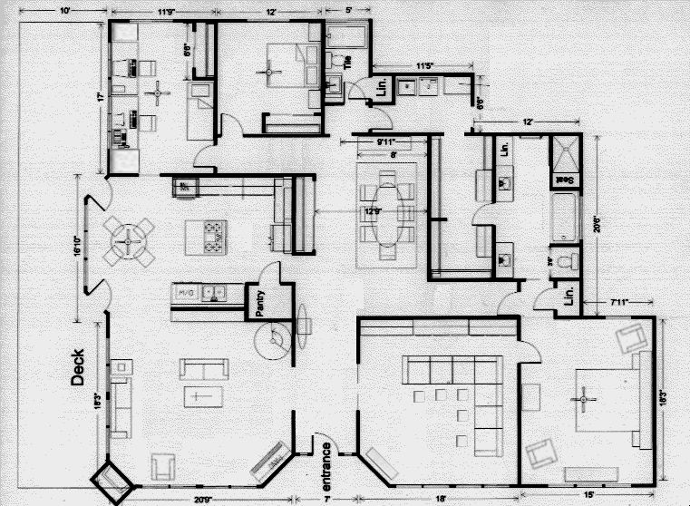 I spent a couple of years studying floor plans and drawing my own. We wanted the house to be all on one level so that we would not have to climb up and down stairs in our old age. We also wanted the rooms to be arranged such that we could be within easy sight and sound of each other even when in different rooms. At the same time, we wanted to be able to close doors when privacy or quiet is needed, which cannot be done with a completely open floor plan.