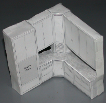 While this model would not earn an A+ in architectural school, it was enough to help me fine tune the layout of the cabinets, including changing the corner to an angled unit with lazy Susans and an appliance garage between the base and upper cabinets. When I showed this to Jim Buss, he could quickly see that I had made the corner cabinet a little too small and suggested reducing the other cabinets in order to enlarge it, making it easier to get things in and out of it.