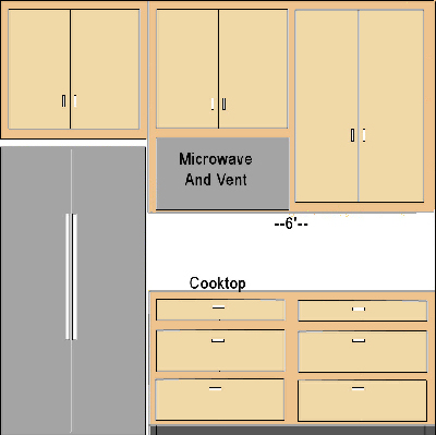 When the plan was done, I was concerned about how the kitchen cabinets would fit in and how many, so I did a vertical drawing of them. That was not too hard to do and proved to be useful.