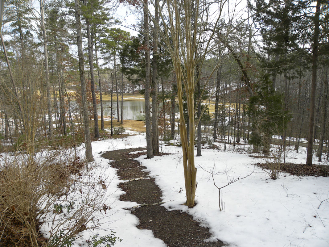 Click here to see the bottom of the yard. Click here to see the golf course view from the bottom of the back yard. Click here to see the yard in snow. With the leaves down, we get a fuller view of the pond. Jump to Locations: East side of the front yard is the house;