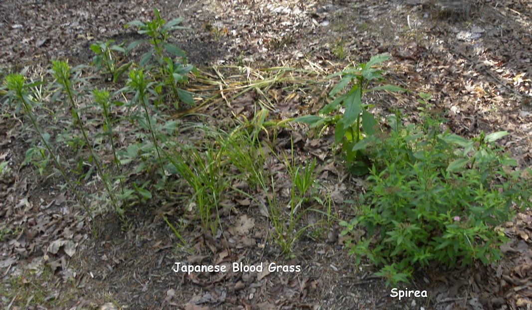 Adjoining these are a pink Spirea, Japanese Bloodgrass, and Salvia.