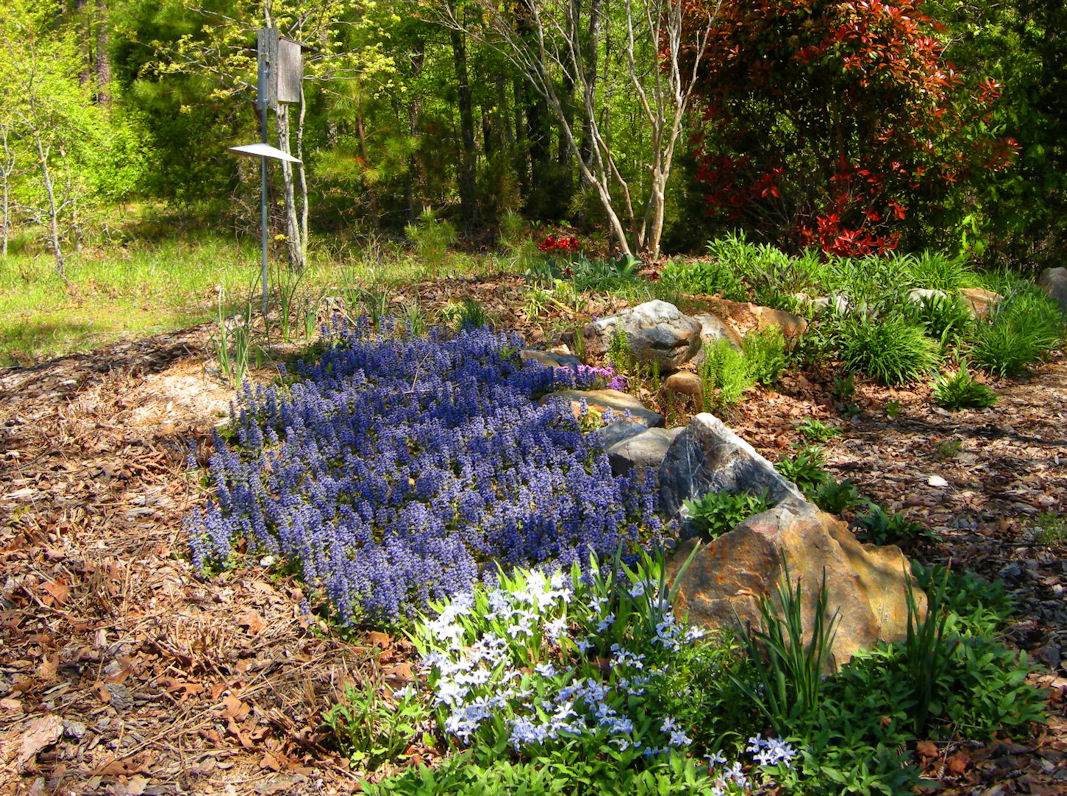 Grape Hyacinth flowers look very similar to the Ajuga flowers, so we planted some bulbs among them.