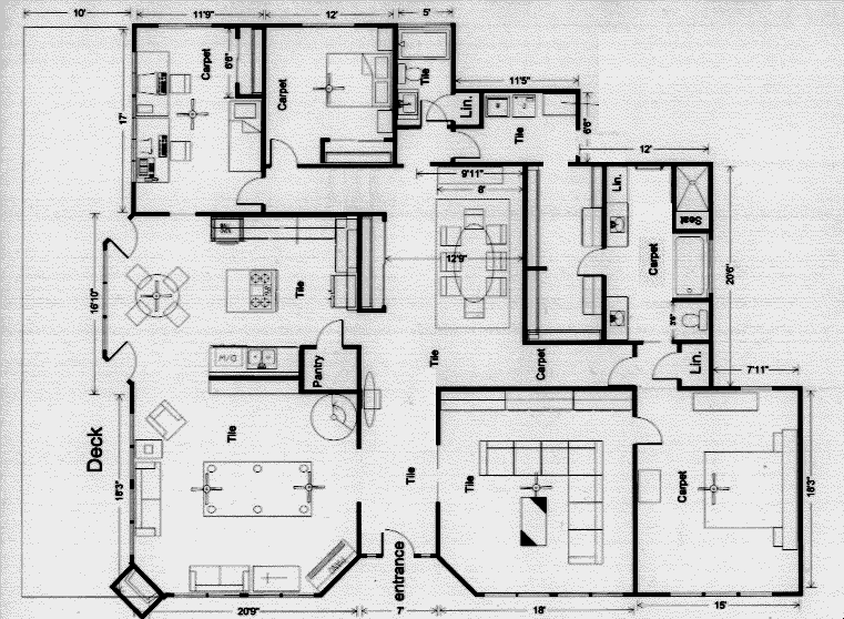 I spent a couple of years studying floor plans and drawing my own. We wanted the house to be all on one level so that we would not have to climb up and down stairs in our old age. We also wanted the rooms to be arranged such that we could be within easy sight and sound of each other even when in different rooms. At the same time, we wanted to be able to close doors when privacy or quiet is needed, which cannot be done with a completely open floor plan.