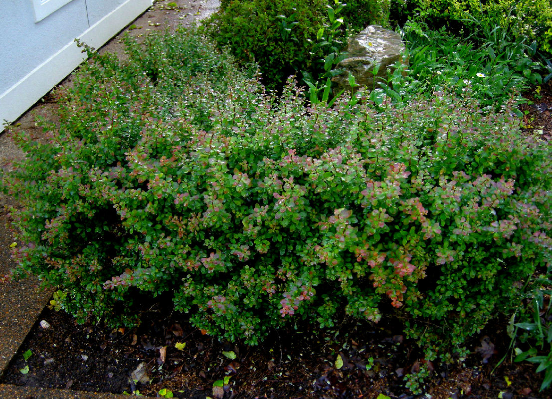 Crimson Pygmy Barberry (Berberis thunbergii 'Atropurpurea Nana') at the top of the circle driveway bed,