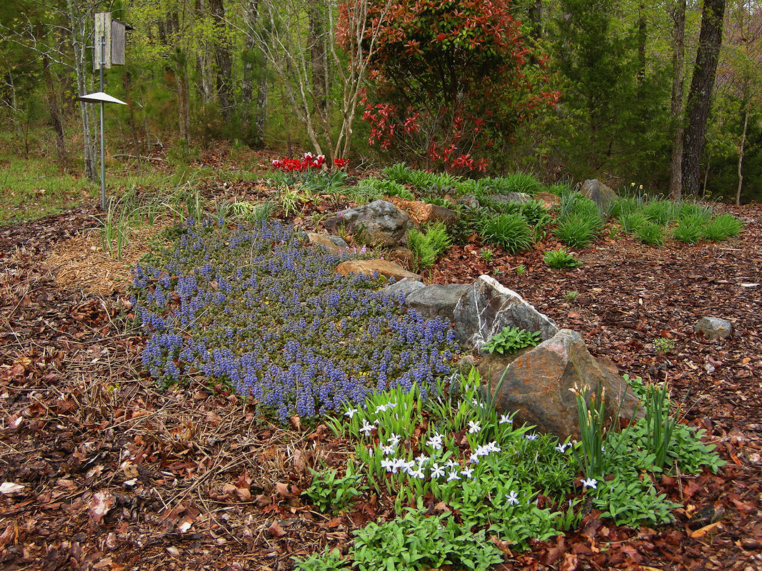 Because the flowers look similar, I thought it would be interesting to mix some grape hyacinths in with the ajuga to extend the flowering time.