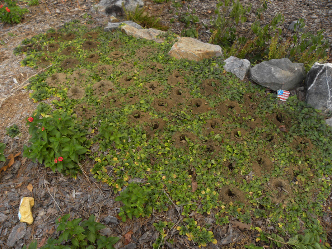 I used the auger to drill holes for the hyacinth bulbs to minimize damage to the ajuga. Even with the auger it was hard digging.
