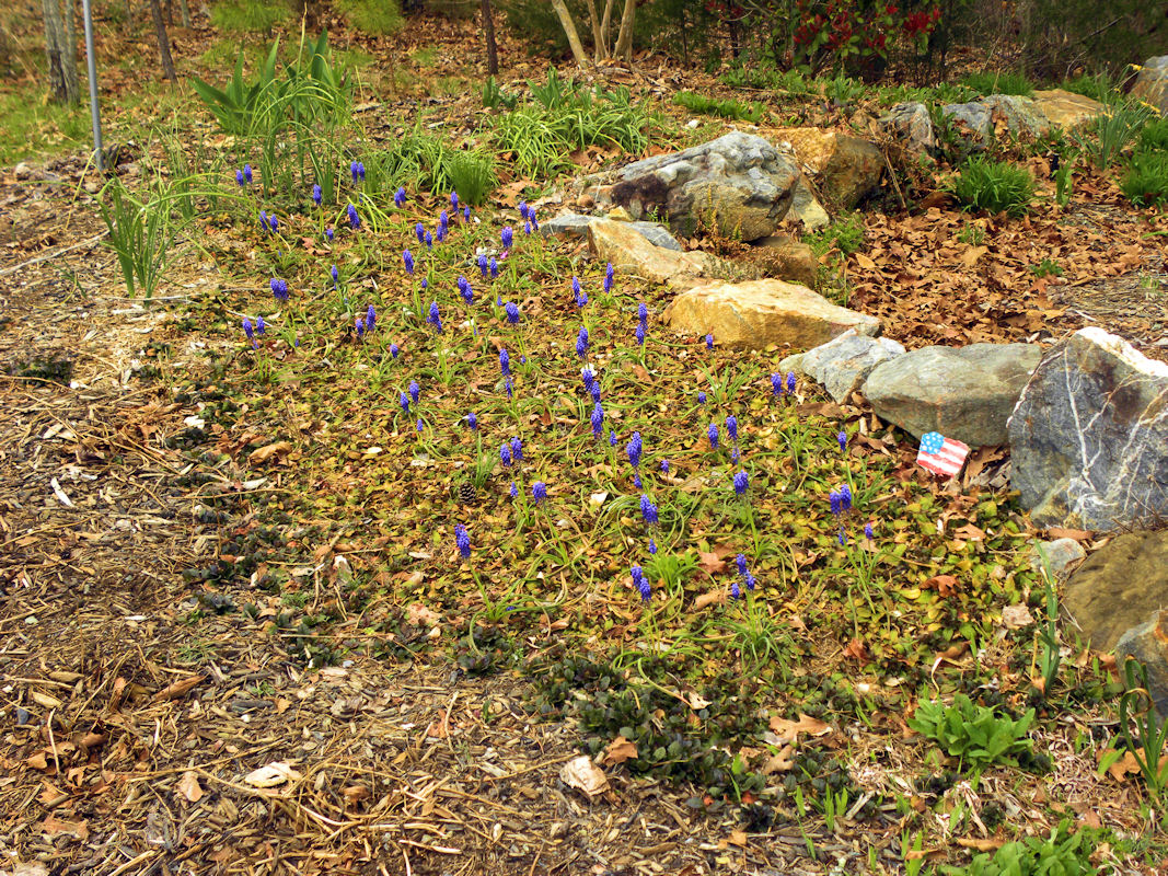 Batch of grape hyacinths under the front cedar tree: