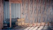 First the studs are sheathed with oriented strand board and then covered with a vapor barrier. Then the concrete boards are nailed over that. |
