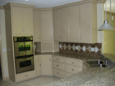 The two upper cabinets to the right of the appliance garage were my 3rd design flaw. (You probably don't want to hire me to design a kitchen for you.) These cabinets have two sets of doors which open facing each other. I had planned that this would be two cabinets, each with shelves going all the way across behind two doors. This is how our kitchen cabinets are. What I overlooked is that our cabinets are only about 27" wide, but Judy's are 36" wide. Shelves that long would sag, eventually, unless bulky supports were added. So the cabinet builder put a dividing wall between each set of doors and the shelves only had to run 18" for each section.