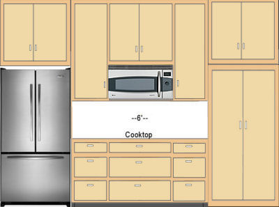 The above right shows the right wall of the kitchen on the floor plan. At first I put the cooktop and microwave/vent to the left next to the refrigerator so that the cabinets to the right of it would be the same width as the cooktop area, 3'.