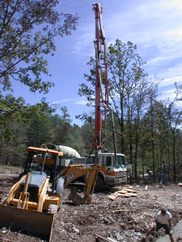 Cement truck uses a hose on a large boom to pour cement: