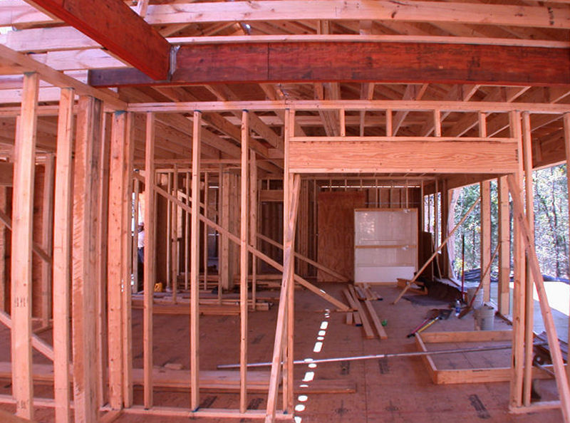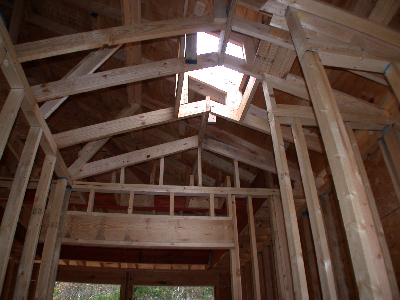the 2x4 studs and 2x6 ceiling joists. Not only are they large, but they are doubled up. Now compare them to the joists used to frame a similar step-up ceiling (above the worker's head)