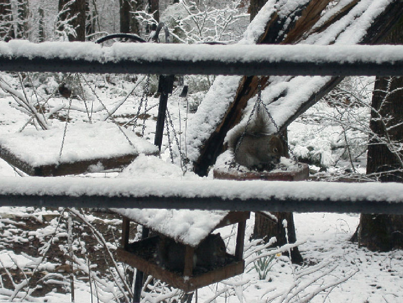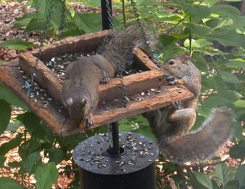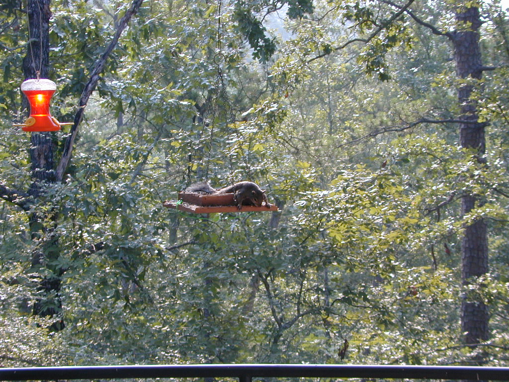 Hard to see, but it's flying squirrels in the bird feeder at night.